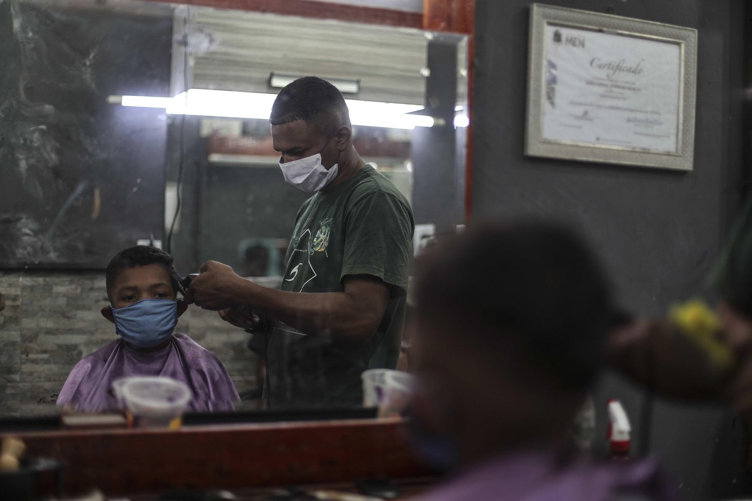 Um barbeiro da favela de Mandela, no Rio de Janeiro, trabalha com máscara de proteção durante pandemia de coronavírus.ANTONIO LACERDA / EFE